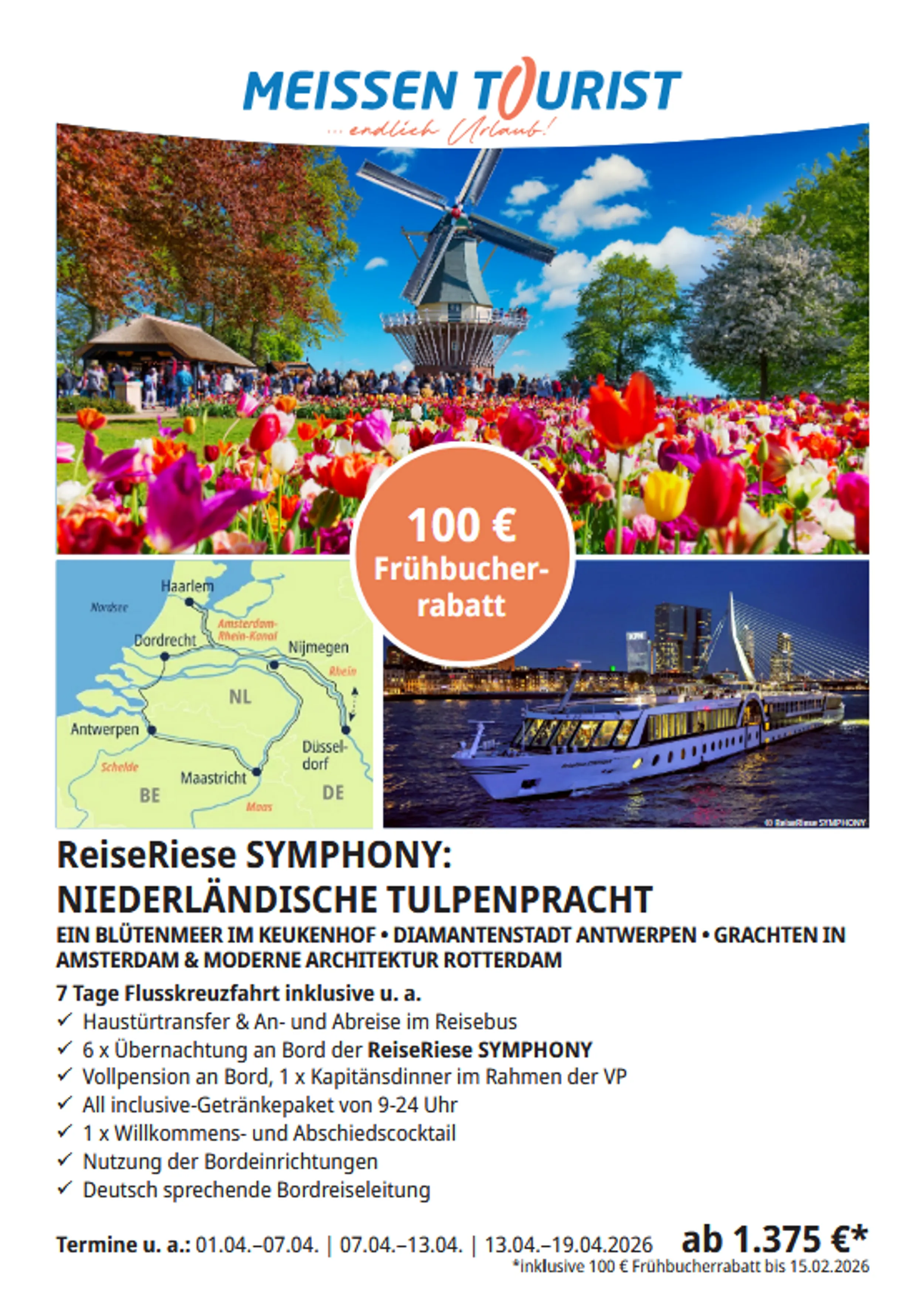 | Nachfolgend stellen wir Ihnen wichtige Informationen/Dokumente zum Download bereit. • Allgemeine Geschäftsbedingungen Diese sind gültig für alle Meissen-Tourist Reiseverträge, die ab 21.07.2025 geschlossen wurden. • Formblatt zur Unterrichtung des Reisenden gemäß §651a BGB • Reiseanmeldung Bitte verwenden Sie dieses Anmeldeformular, sofern Sie die Buchung nicht über den Meissen-Tourist Agenturlogin tätigen. • Buchungshinweise - Achten Sie auf korrekte Erfassung von Adressen/Telefonnummern/Mailadressen. Bei nachträglichen Änderungen kann eine Bearbeitungsgebühr erhoben werden. - Bei mehreren Zimmern auf einer Buchung: Kundenwünsche korrekt erfassen - Reiseversicherungen nur bei Festbuchung abschließen (nicht bei Optionen, Anfragen, Wartelisten) - Zusatzleistungen (Ausflüge, Eintrittskarten, Verpflegung) bitte bei Buchung anmelden Hinweis: Unsere Kunden benötigten zum Reiseantritt keine Reiseunterlagen in Papierform. Es genügt, wenn die Unterlagen dem Kunden informativ in digitaler Form (z. B. per E-Mail / PDF) vorliegen. Daher werden die Buchungsbestätigung und Reiseunterlagen per E-Mail verschickt. Bitte achten Sie auf korrekt angegebene E-Mail-Adressen. |